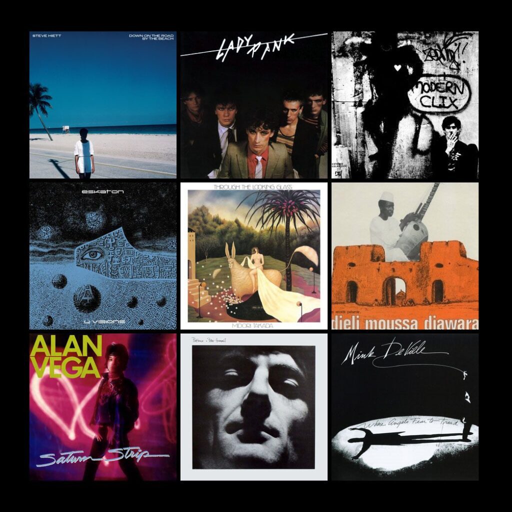 These artists were completely new to me: Lady Pank (new wave, pop reggae, post-punk from Poland), Steve Hiett (ambient surf/dream/psych pop from UK fashion photographer), Charly García (new wave, synthpop, art pop, sophisti-pop from Argentina), Eskaton (French Zeuhl, prog, progressive electronic), and Midori Takada (Japanese ambient, minimalism, new age). I knew all the following artists but was inspired to give a complete listen to their particular 1983 releases: Kix, Djeli Moussa Diawara, Alan Vega, Peter Hammill, Mink DeVille, Articles Of Faith, Billy Bragg, Marshall Crenshaw, Alien Sex Fiend, Marc and the Mambas, Split Enz, Miles Davis, Amenophis.