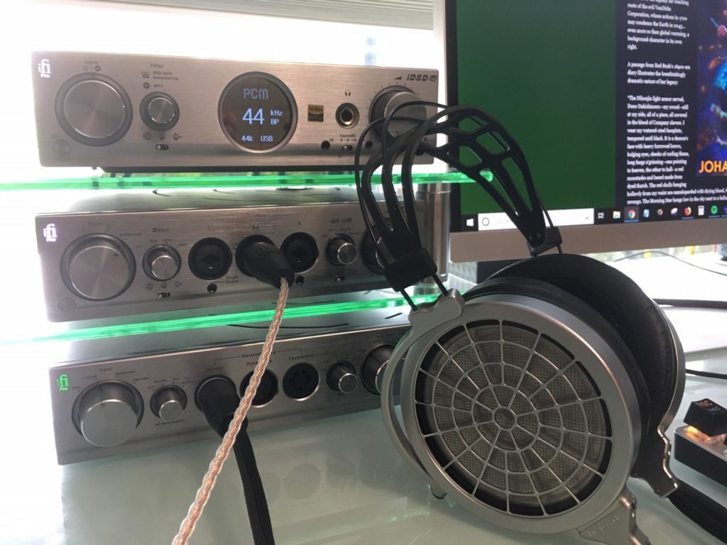 My previous rig was the Meier Audio Corda Classic + Daccord, which served me well for several years, but both units did end up having problems and they had to be shipped to Germany for repair. Jan Meier paid for the shipping, but it was still several weeks I had to go without my my rig. I’ve listened to the insanely priced Chord DAVE, and the difference in sound in these electronics are really minimal compared to differences in headphones. For me, it’s all about the features, and the iFi Pro stack is full of them, particularly the ability to switch between digital, tube and tube + hybrid options for a variety of sound signatures. the iCAN has tons of power, ably driving my power-hungre HE-6. While my favorite feature of the Meier gear was his crossfeed circuit, iFi offers a 3D option that serves about the same purpose, to simulate the natural crossfeed your ears experience in a room so that your brain doesn’t get fatigued trying to make sense of totally separate L/R input. The benefits are subtle, but I think it helps. Also, gotta love that XBass!